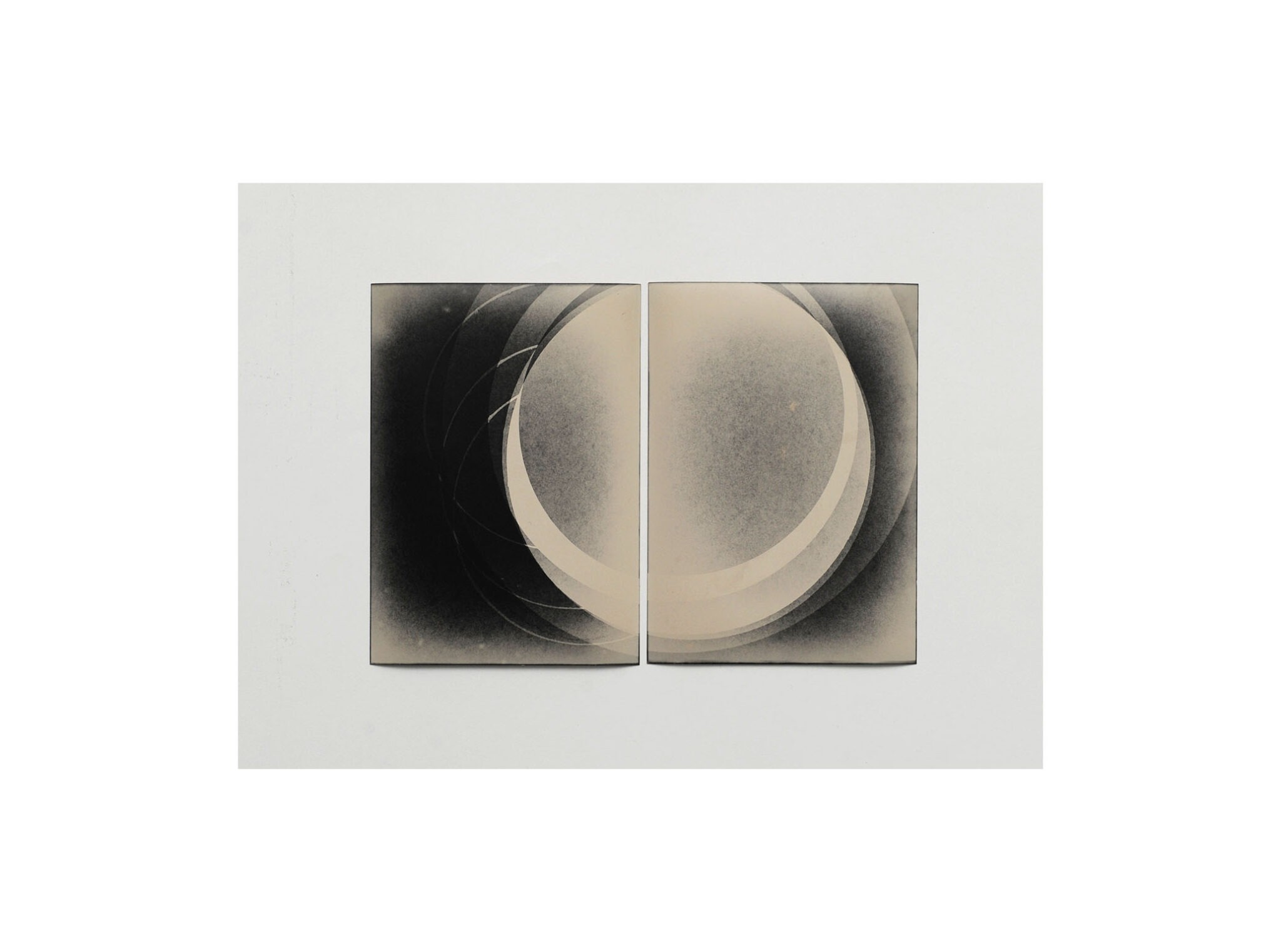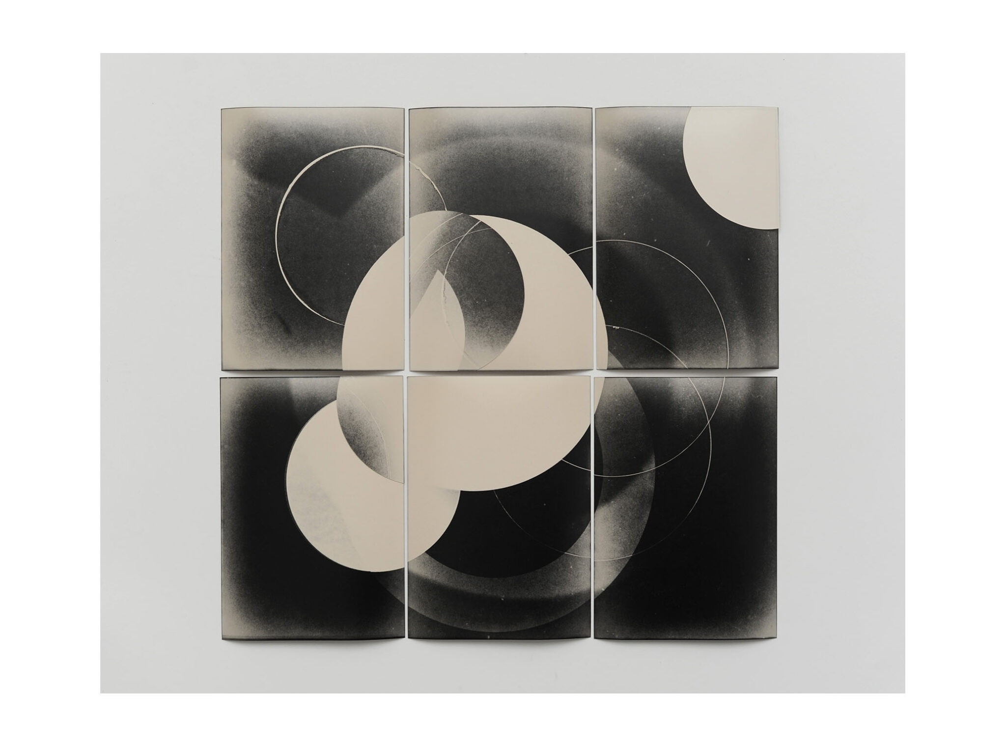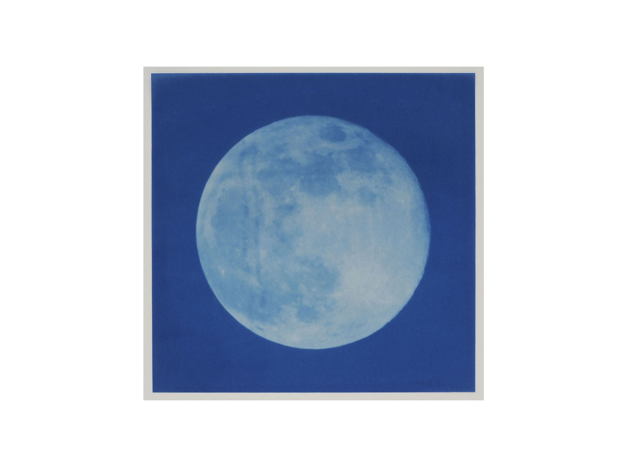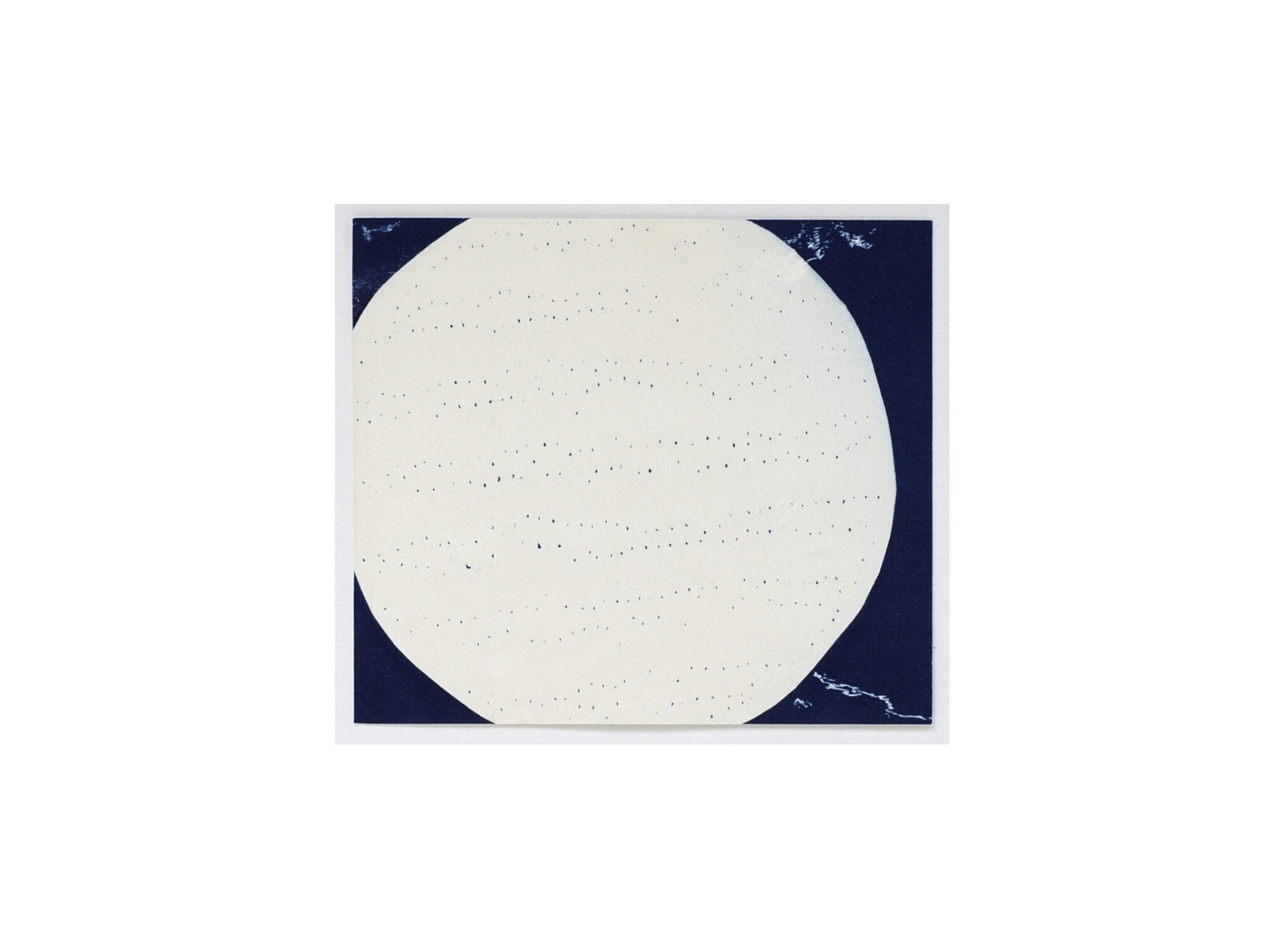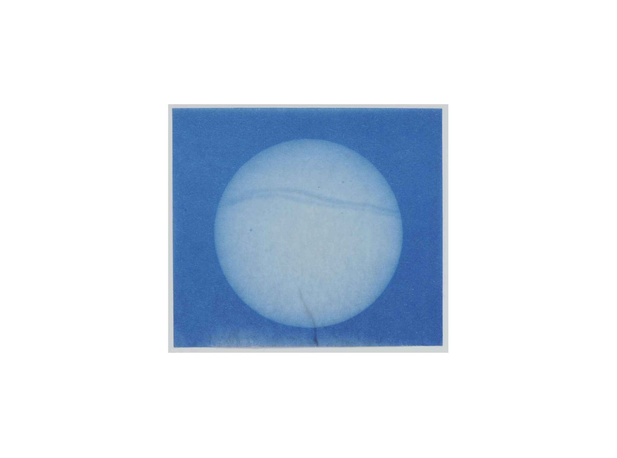 Cyanotype on paper: Eclipse 1, 2 and 3, 30 x 30 cm, 2023. Sun, 11,5 x 13,5 cm, 2023. Moon (ragged), 21 x 26 cm, 2020. Little Holes, 16 x 17 cm, 2020. Full Moon, 22 x 22 cm, 2023. Moon, 22 x 22 cm, 2023.